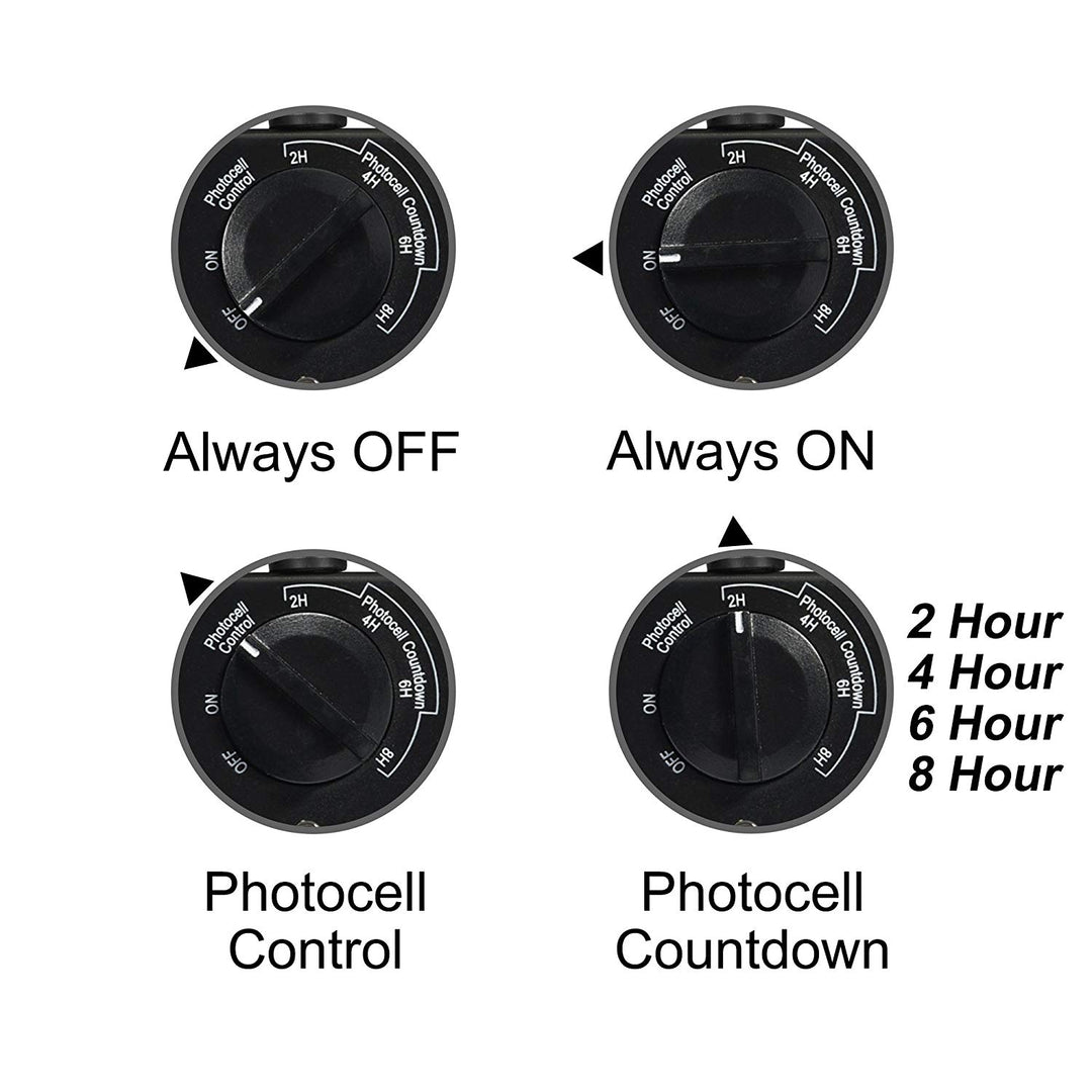 You can choose from several scheduling options: dusk-dawn, 2 hours, 4 hours, 6 hours, or 8 hours after dusk, providing flexibility based on your lighting needs.